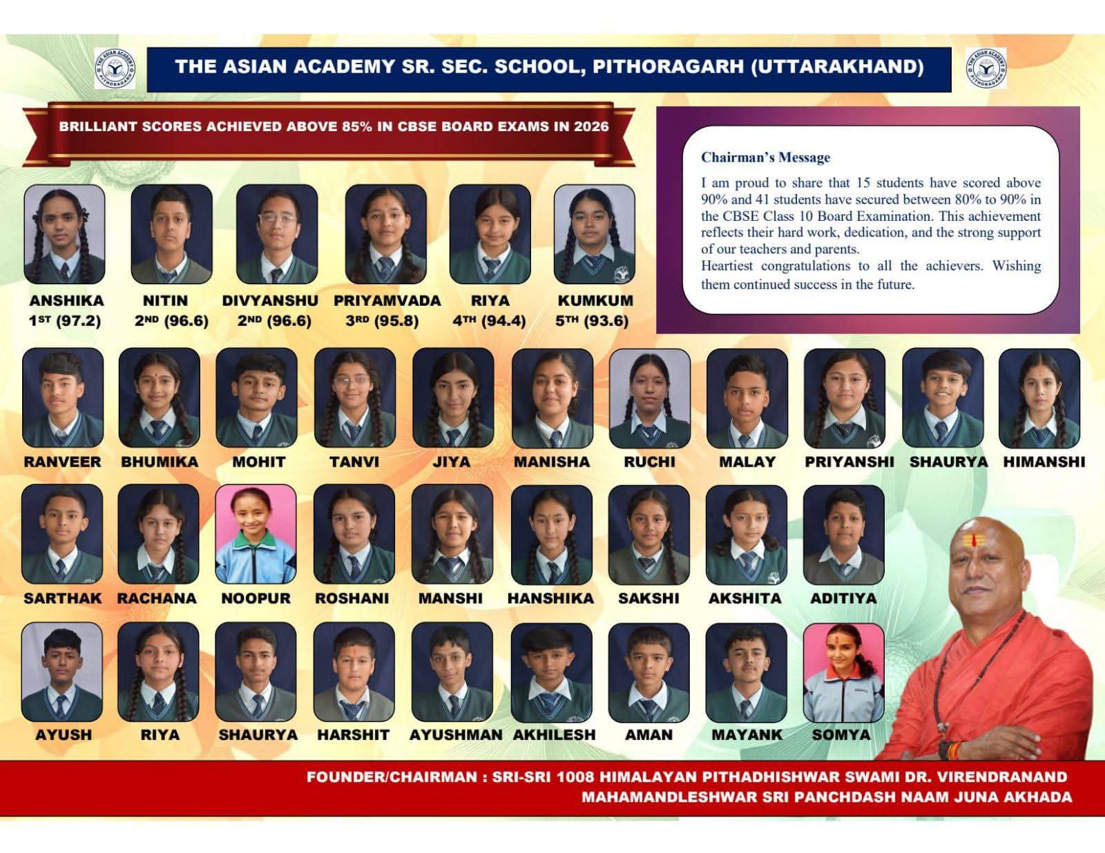 CBSE 10वीं बोर्ड परीक्षा 2026 में पिथौरागढ़ की एशियन एकेडमी ने एक बार फिर शानदार परिणाम देकर अपनी शैक्षिक गुणवत्ता साबित की है। इस वर्ष छात्रों ने मेहनत, अनुशासन और समर्पण के दम पर ऐसा प्रदर्शन किया है, जिसने पूरे विद्यालय परिवार और अभिभावकों को गर्व से भर दिया है।