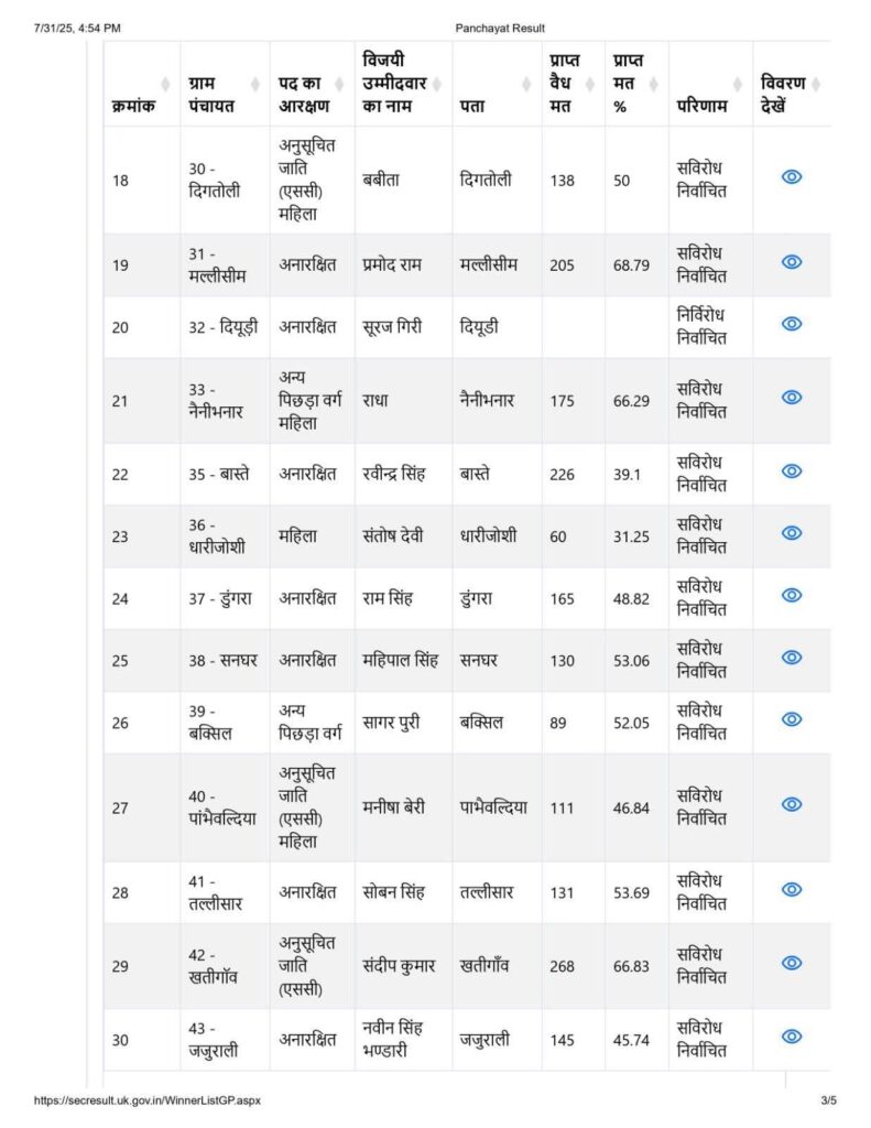 झुनी पंचायत से बबीता देवी, मलान से बिमला रावत, और सटगल से सुषमा देवी ने जीत दर्ज की है।