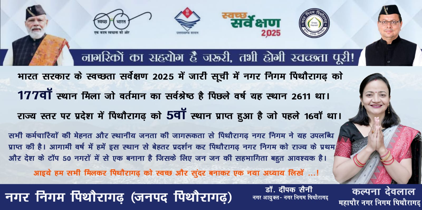 स्वच्छ भारत मिशन के तहत हुए स्वच्छता सर्वेक्षण 2025 में पिथौरागढ़ नगर निगम ने जबरदस्त प्रदर्शन करते हुए राष्ट्रीय स्तर पर 177वीं रैंक हासिल की है। यह पिछले वर्ष की तुलना में बड़ी छलांग है, जब नगर निगम की रैंकिंग 2611वीं थी।
