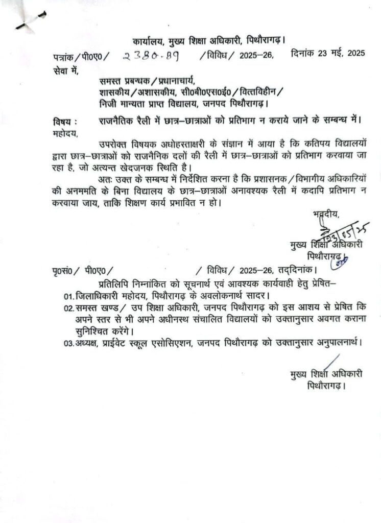पिथौरागढ़, 26 मई 2025 — जिले में अब किसी भी छात्र या छात्रा को राजनीतिक दलों की रैली में बिना पूर्व अनुमति के शामिल नहीं किया जा सकेगा। मुख्य शिक्षा अधिकारी कार्यालय द्वारा जारी आदेश में स्पष्ट किया गया है कि कुछ विद्यालयों द्वारा छात्रों को राजनीतिक गतिविधियों में जबरन भेजा जा रहा था, जिससे शिक्षा व्यवस्था प्रभावित हो रही थी।